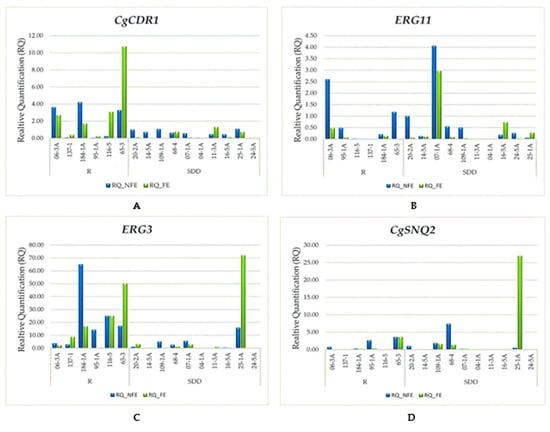 (A) Relative expression levels of the CgCDR1 gene for strains not exposed vs. strains exposed to fluconazole. (B) Relative expression levels of the ERG11 gene for strains not exposed vs. strains exposed to fluconazole. (C) Relative expression levels of the ERG3 gene for strains not exposed vs. strains exposed to fluconazole. (D) Relative expression levels of the CgSNQ2 gene for strains not exposed vs. strains exposed to fluconazole.