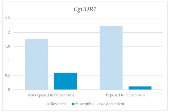 As shown in Table 1 and Figure 2, the relative expression levels of the CgCDR1 gene in the fluconazole-exposed, resistant strains were higher than those in the non-exposed ones. However, these differences were not statistically significant (exposed, 2.22; non-exposed, 1.76; p = 0.231). On the contrary, the fluconazole-exposed, susceptible, dose-dependent strains were found to have lower relative expression levels than the non-exposed ones, and a statistically significant difference (RQ value for the susceptible, dose-dependent strains that were exposed was 0.11, and for the non-exposed, it was 0.59, with p = 0.046) was identified. According to the classification based on the susceptibility profile, higher RQ medians were obtained for the resistant strains, both for those exposed and those not exposed to fluconazole, compared to the susceptible, dose-dependent ones.