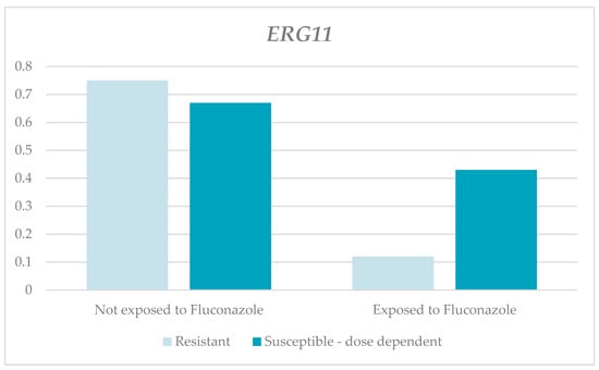 The relative expression levels of the ERG11 gene in the resistant and susceptible, dose-dependent strains were lower in those exposed to fluconazole compared to those not exposed. Nevertheless, these differences were not significant (RQ-resistant for those exposed, 0.12, and for those not exposed, 0.75, with p = 0.065; RQ-susceptible and dose-dependent for those exposed, 0.43, and for those not exposed, 0.67, with p = 0.086). Between the two groups and according to the susceptibility profiles, there were higher average RQs in the susceptible, dose dependent strains than in the resistant ones (Table 1 and Figure 3).