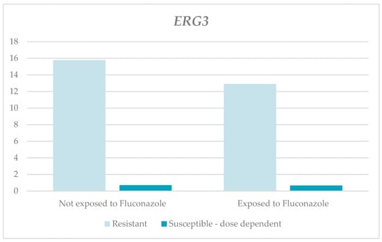 On the other hand, the relative expression levels of the ERG3 gene in the resistant and susceptible, dose-dependent strains exposed to fluconazole were lower than in those not exposed, with statistically non-significant differences (RQ-resistant for those exposed, 12.9, and for those not exposed, 15.77, with p = 0.343; RQ-susceptible and dose-dependent for those exposed, 0.66, and for those not exposed, 0.71, with p = 0.399). There were higher RQ medians in the resistant strains, for both those exposed and those not exposed to fluconazole, than in the susceptible, dose-dependent strains, as can be observed in Table 1 and Figure 4.