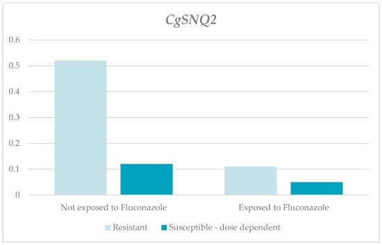 Lastly, the relative expression levels of the CgSNQ2 gene in both the resistant and susceptible, dose-dependent strains were lower in the strains exposed to the antifungal. However, the differences were only significant for the resistant group (RQ-resistant for those exposed, 0.11, and for those not exposed, 0.52, with p = 0.014; RQ-susceptible and dose-dependent for those exposed, 0.05, and for those not exposed, 0.12, with p = 0.166). The RQ medians were higher in both the exposed and not-exposed resistant strains compared to the susceptible, dose-dependent strains (Table 1 and Figure 5).
