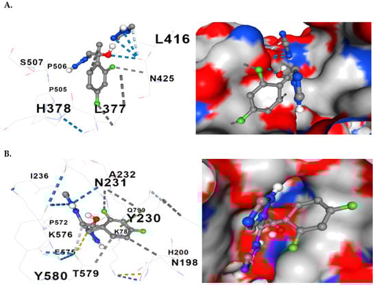 Comparative representations of fluconazole and the proteins of interest docking. (A) Three-dimensional presentation of the molecular relationship (docking) between fluconazole and ERG11. (B) Three-dimensional presentation of the molecular relationship between fluconazole and CgCDR1. Hydrophobic interactions with the residues are shown with dashed gray lines and with gray surfaces on the proteins.