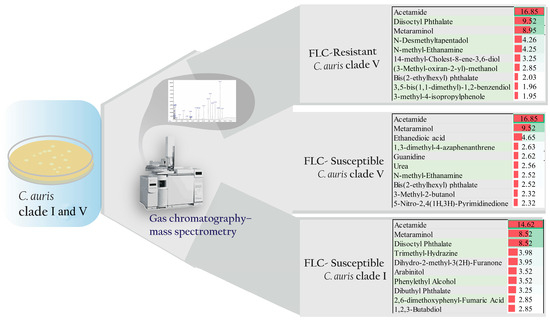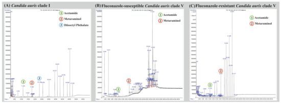 - Semreen, M.H.; Soliman, S.S.M.; Saeed, B.Q.; Alqarihi, A.; Uppuluri, P.; Ibrahim, A.S. Metabolic Profiling of Candida auris, a Newly-Emerging Multi-Drug Resistant Candida Species, by GC-MS. Molecules 2019, 24, 399. [Google Scholar] [CrossRef] [PubMed]