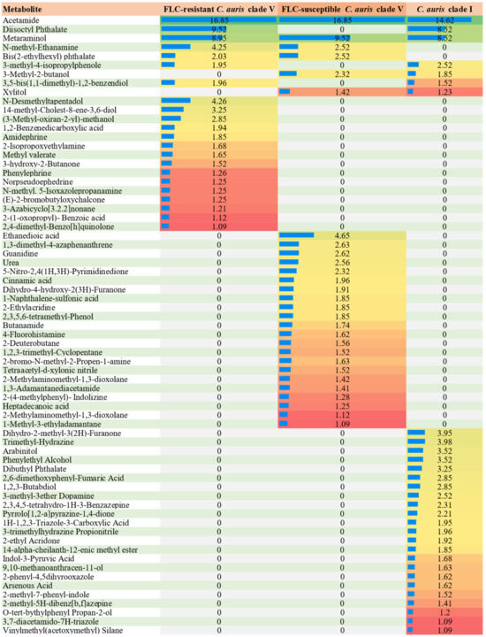 Barough, R.E.; Javidnia, J.; Davoodi, A.; Talebpour Amiri, F.; Moazeni, M.; Sarvi, S.; Valadan, R.; Siahposht-Khachaki, A.; Moosazadeh, M.; Nosratabadi, M.; et al. Metabolic Patterns of Fluconazole Resistant and Susceptible Candida auris Clade V and I. J. Fungi 2024, 10, 518. https://doi.org/10.3390/jof10080518