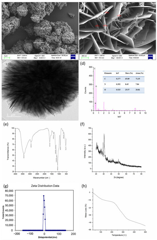 Characterization of CS-DIF microcapsules. (a,b) SEM images with different magnification; (c–h) TEM, EDX, FTIR, XRD, zeta potential, and TG.