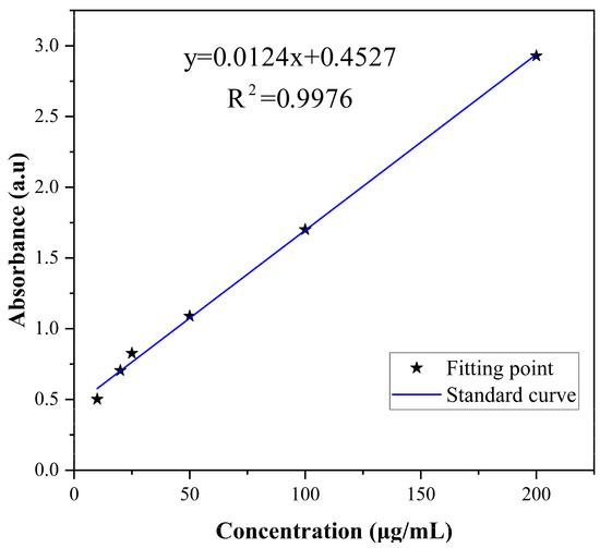 The corresponding relation between the concentration and absorbance of difenoconazole is shown in Figure 2. The standard curve was y = 0.0124x + 0.4527, and the correlation coefficient R2 = 0.9976, indicating that difenoconazole had a good linear correlation with absorbance in the range of 5–200 μg/mL. EE and LD were calculated as 85.58% and 61.98%, respectively, using the standard curve and the equations of EE and LD. As shown in the literature, larger particles provide higher drug encapsulation efficiency [53].