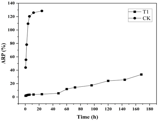 As shown in Figure 3, the synthesized CS-DIF microcapsules exhibited prominent controlled-release performance compared with the control. Difenoconazole (CK) alone released 43.93% in 0.5 h, and the ARP reached 109.46% after incubating for 4 h. However, the CS-DIF microcapsules (T1) exhibited obvious controlled-release characteristics during the slow-release stage from 0.5 to 48 h. The release rate was in the range of 1.8–5.53% and increased from 11.87% to 33.6% in the rapid-release stage from 60 to 168 h. This was similar to previous findings, indicating that the release time of fungicides was much longer compared with that of hexaconazole (130 h) and dazomet (50 h). On encapsulation into chitosan nanoparticles, the cumulative release rates were 93.6% and 76.4% [54].