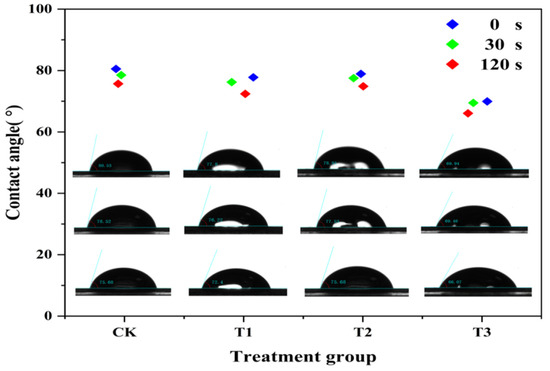 The wettability performance of 200 μg/mL chitosan (T1), difenoconazole (T2), and CS-DIF microcapsules (T3) on maize leaves were compared in terms of contact angle. As shown in Figure 4, the contact angle of all the treatments and water (CK) decreased gradually with time. In the range of 0–120 s, the contact angle of CK decreased from 80.53° to 75.68°. The T1 decreased from 77.8° to 72.4°, T2 decreased from 78.91° to 75.68°, and T3 decreased from 69.94° to 66.07°. The contact angle of T2 was similar to that of CK (75.68°), whereas the contact angle of T1 and T3 decreased by 3.28° and 9.61° in 120 s, respectively. The result demonstrated that CS-DIF microcapsules could effectively reduce the contact angle of drops on maize leaves and enhance their support of the leaf surface. Rotenone-loaded mesoporous silica nanoparticles (RotMSNS) could significantly decrease the contact angle from 83° to 64°, improving the support of the leaf surface compared with treatments with rot suspension or water [55].