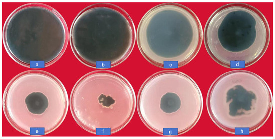 Colony growth of C. lunata treated with CS-DIF microcapsules, difenoconazole, and chitosan. (a) control, (b–f) represent the concentration of CS-DIF microcapsules was at 10, 20, 50, 100, and 200 μg/mL, respectively, (g) 200 μg/mL difenoconazole, (h) 200 μg/mL chitosan.
