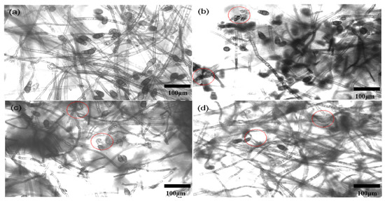 The mycelium morphology of C. lunata treated with 200 μg/mL CS-DIF microcapsules, difenoconazole, and chitosan is shown in Figure 6. For the control, the mycelium was intact and had a smooth appearance (Figure 6a). However, it exhibited different degrees of damage, such as distortion and deformation, when treated with 200 μg/mL difenoconazole (Figure 6c) and chitosan (Figure 6d). In particular, the mycelium treated with 200 μg/mL CS-DIF microcapsules was obviously broken and disintegrated (Figure 6b). The abnormal change in mycelium was labeled with dotted lines and circles.