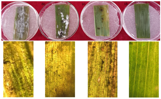 Influence of in vitro inoculation on detached maize leaves. (a) Control strain; (b–d), 200 μg/mL chitosan, difenoconazole, and CS-DIF microcapsules; (e–h), local microscopic images of (a–d) with a microscopic magnification of 100×.