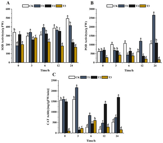 Influence on antioxidant enzyme activity. (A) SOD; (B) POD; and (C) CAT. T1–T3 represent 200 μg/mL chitosan, difenoconazole, and CS-DIF microcapsules, respectively. Significant differences were determined using one-way ANOVA and Duncan’s multiple range test, as indicated with different letters in the same column of different groups at the p < 0.05 significance level.