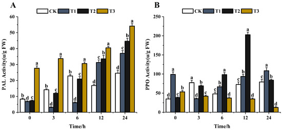 Influence on phenolic metabolism enzyme activity. (A) PAL; (B) PPO. T1–T3 represent 200 μg/mL of chitosan, difenoconazole, and CS-DIF microcapsules, respectively. Significant differences were determined using one-way ANOVA and Duncan’s multiple range test, as indicated with different letters in the same column of different groups at the p < 0.05 significance level.