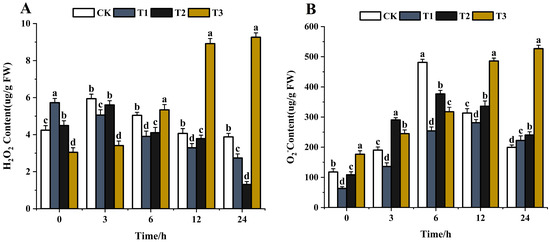 Influence on reactive oxygen species. (A) H2O2; (B) O2−. T1–T3 represent 200 μg/mL of chitosan, difenoconazole, and CS-DIF microcapsules, respectively. Significant differences were determined using one-way ANOVA and Duncan’s multiple range test, as indicated with different letters in the same column of different groups at the p < 0.05 significance level.