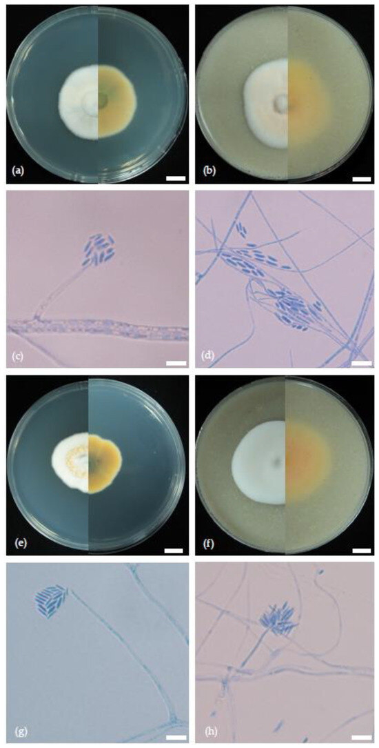 Morphological characteristics of S. oryzae (a–d) and S. attenuatum (e–h) isolated from sheath rot and dirty panicle diseases of rice. (a,b,e,f): colonies were grown on (a) PDA and (b) oatmeal agar (left seen from above and right from below); (c,d,g,h): simple and branched conidiophores, phialide producing conidia in chains, cylindrical conidia. Scale bars (a,b,e,f) = 1 cm; (c,d,g,h) = 10 μm.