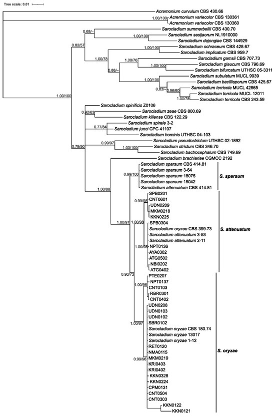 Nucleotide sequences of ITS, D1/D2 of 28S and ACT of S. oryzae, S. attenuatum, S. sparsum and other Sarocladium species were obtained from NCBI. Multiple sequence alignment of the genes was performed using ClustalW in MEGA X [27]. The concatenated alignment was subject to maximum likelihood (ML)-based phylogenetic analysis using RAxML v.8.2.12 [28] via CIPRES [29] and Bayesian inference (BI) with MrBayes v.3.2.7 [30]. The best sequence evolution model was selected using jModelTest v.2.1.10 [31]. The robustness of the nodes on the obtained phylogenetic tree was evaluated with 1000 bootstrap replications for ML. For the BI, four Monte-Carlos Markov chains (two cold chains) were implemented for 5 million generations, sampled every 1000 generations. The first 25% of generations were excluded as burn-in. The nodes were evaluated with the posterior probability following the Bayesian inference. The tree was drawn to scale, with branch lengths measured in the number of substitutions per site. The analysis involved a total of 41 nucleotide sequences. All positions containing gaps and missing data were eliminated (complete deletion option).