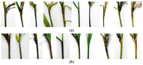 Dirty panicle and sheath rot on panicles and flag leaf sheaths at 21 days after inoculation with a spore suspension of (a) S. attenuatum isolate KKN0225 and (b) S. oryzae isolate KKN0122 on 10 differential rice cultivars.
