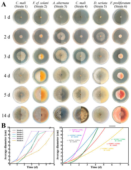 The growth of isolated fungi on PDA media. (A): Strain 1–6 cultured on PDA medium for different days; (B): growth curve (left) and polynomial regression model (right) for the growth of the six isolated fungi on PDA media. In (A), scale bar = 3 cm.