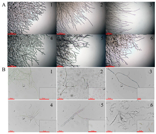Mycelia and conidia observation results for the six isolated fungi. (A): Mycelia at the edge of the PDA dish; (B): Morphology of mycelia and conidia. 1–6 is for Strain 1–6, respectively.