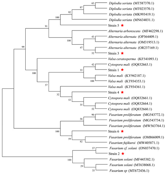 A phylogenetic tree was further constructed using these ITS sequences (Figure 4). Results revealed that Strains 1–6 are close to C. mali (OQ832663.1), F. cf. solani (ON037470.1), A. alternata (OR237169.1), C. mali (OQ832661.1), D. seriata (MN634031.1), and F. proliferatum (OM866009.1), respectively. Therefore, the isolated Strain 1 and Strain 4 are identified as C. mali, and the Strains 2, 3, 5 and 6 are identified as F. cf. solani, A. alternata, D. seriata and F. proliferatum, respectively.