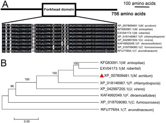 Figure 1. Features of MaSep1. (A) The location and multiple sequence alignment analysis of Forkhead domain. (B) Phylogenetic tree of Sep1 in different filamentous fungi. The phylogenetic tree was performed using MEGA software. M. acridum (XP_007809481.1), Ustilaginoidea virens (XP_042997205.1), M. anisopliae (KFG83091.1), M. robertsii (EXV04173.1), Pochonia chlamydosporia (XP_018146967.1), Fusarium decemcellulare (KAF4992049.1), Cordyceps fumosorosea (XP_018709080.1), and Trichoderma arundinaceum (RFU77654.1). Red triangle represented the Sep1 homologous protein in M. acridum.