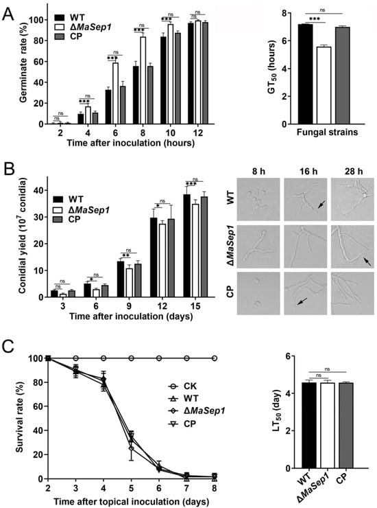 Figure 2. Conidial germination and conidial production. (A) Conidial germinations. (B) Conidiation. Black arrows represent conidia on the conidiophores. (C) The survival rates of the locusts, L. migratoria manilensis, and LT50 of the fungal strains were evaluated following topical inoculation with 5 μL conidial suspensions. Error bars indicate the standard error of the mean (SEM) from triplicated assays. ns, not significant, p > 0.05. *, p < 0.05; **, p < 0.01; ***, p < 0.001.