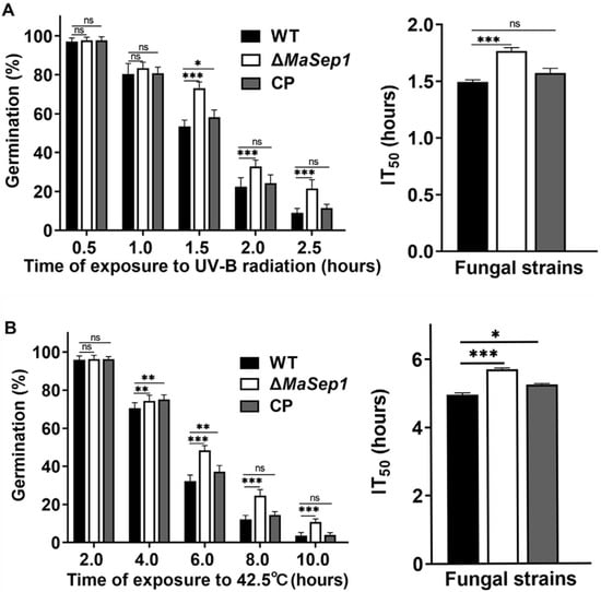 Figure 3. Deletion of MaSep1 increased the fungal tolerances to UV-B and heat shock. (A) Conidial germination rates and IT50 of fungal strains after UV-B irradiation at 1350 mW/m2 for 0.5, 1.0, 1.5, 2.0, and 2.5 h. (B) Conidial germination rates and IT50 of fungal strains after heat shock at 42.5 °C for 2, 4, 6, 8, and 10 h. Error bars indicate the SEM from triplicated assays. ns, not significant, p > 0.05. *, p < 0.05; **, p < 0.01; ***, p < 0.001.