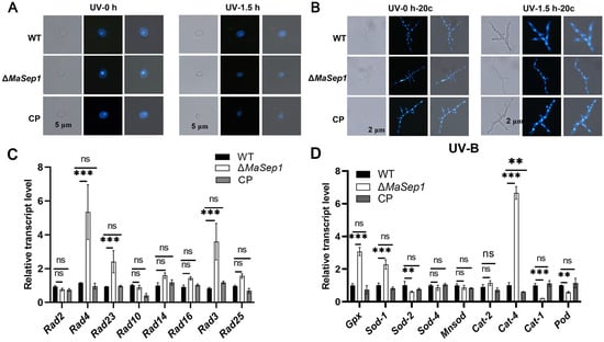 To assess DNA damage in conidia from different fungal strains after UV-B irradiation, conidia treated with 1.5 h of UV-B irradiation and conidia incubated on 1/4 SDAY medium for 20 h after 1.5 h of UV-B irradiation were stained with DAPI, respectively. The results indicated that the DNA in fungal strains was severely damaged to a comparable extent and exhibited a diffuse pattern after 1.5 h of treatment with UV-B irradiation (Figure 4A). However, the conidia of ΔMaSep1 germinated to form long mycelium, and the damaged DNA was repaired and became aggregated again after 20 h of incubation, while the conidia of WT and CP still had the ability to germinate but their DNA was still in a diffuse state (Figure 4B). qRT-PCR showed that the expression of most of the genes (Rad3, Rad4, Rad23) in the NER pathway was significantly upregulated in ΔMaSep1 (Figure 4C). To understand the differences in the ROS scavenging ability of the WT, ΔMaSep1, and CP strains, conidia incubated for 20 h after UV-B irradiation were collected to detect the transcriptional levels of some genes related to ROS scavenging by qRT-PCR. The findings displayed that most of the oxidoreductase-encoding genes (Gpx, Sod, and Cat) involved in ROS scavenging were significantly upregulated in ΔMaSep1 (Figure 4D).
