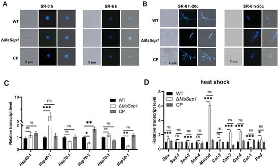 To explore the effect of heat shock stress on the DNA of WT, ΔMaSep1, and CP strains, conidia exposed to heat shock for 6 h and conidia incubated for 20 h after 6 h of heat shock were, respectively, collected and stained using DAPI to observe the DNA damage. The results showed that after 6 h of exposure to heat shock, DNA in all fungal strains was severely damaged in a diffuse manner (Figure 5A). However, after 20 h of incubation, the conidia of ΔMaSep1 germinated to form long mycelium and the damaged DNA was repaired and became aggregated again, while the conidia of WT and CP still had the ability to germinate but their DNA was still in a diffuse state (Figure 5B). qRT-PCR showed that Hsp40-2 in ΔMaSep1 was significantly upregulated (Figure 5C). Similar to the UV-B treatments, conidia from the WT, ΔMaSep1, and CP strains incubated for 20 h after heat shock were collected to detect the transcriptional levels of some genes related to ROS scavenging by qRT-PCR. The results displayed that most of the oxidoreductase-encoding genes (Gpx, Sod, Cat) involved in ROS scavenging were significantly upregulated in ΔMaSep1 (Figure 5D).