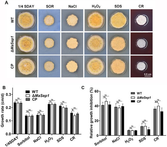 Additionally, fungal responses to oxidative stress (H2O2), cell wall stress (CR), cell membrane stress (SDS), and osmotic stress (SOR and NaCl) were evaluated. The findings demonstrated that the colony morphology of ΔMaSep1 exhibited insignificant differences compared to the WT and CP strains, except when grown on 1/4 SDAY medium added with CR (Figure 6A). The disruption of MaSep1 significantly reduced the fungal growth rate on 1/4 SDAY containing the CR (Figure 6B). For the relative inhibition rate, ΔMaSep1 was more sensitive to CR than WT and CP (Figure 6C).
