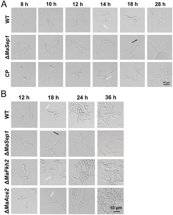 Figure 7. Conidiation pattern analyses of fungal strains grown on SYA medium. (A) The conidiation patterns of WT, ΔMaSep1, and CP strains. (B) The conidiation patterns of WT, ΔMaSep1, ΔMaFkh2, and ΔMaAce2 strains. Black arrows represent normal conidiation. White arrows represent microcycle conidiation.
