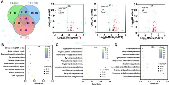 RNA-seq was performed to recognize DEGs between the ΔMaSep1 and WT strains cultivated on SYA medium for 8, 10, and 12 h. In total, 127 DEGs were found between the ΔMaSep1 and WT strains (Table S2). Of these DEGs, 112 DEGs were upregulated and 15 DEGs were down-regulated in ΔMaSep1 (Figure 8A). At 8 h, 29 DEGs showed upregulation, while 4 DEGs were down-regulated in ΔMaSep1. The KEGG pathways of these DEGs were significantly enriched in DNA replication, purine metabolism, glutathione metabolism, nucleotide excision repair, pentose and glucuronate interconversions, carbon metabolism, cyanoamino acid metabolism, base excision repair, and TCA cycle (Figure 8B). At 10 h, 80 DEGs were upregulated and 11 DEGs were down-regulated in ΔMaSep1. The KEGG pathways of these DEGs were significantly enriched in fatty acid degradation, glycerolipid metabolism, β-alanine metabolism, phenylalanine metabolism, isoquinoline alkaloid biosynthesis, starch and sucrose metabolism, limonene and pinene degradation, tyrosine metabolism, glycine, serine and threonine metabolism, and tryptophan metabolism (Figure 8C). At 12 h, 59 DEGs were upregulated and 4 DEGs were down-regulated in ΔMaSep1. The KEGG pathways of these DEGs were significantly enriched in limonene and pinene degradation, pyruvate metabolism, arginine and proline metabolism, ascorbate and aldarate metabolism, betalain biosynthesis, isoquinoline alkaloid biosynthesis, cyanoamino acid metabolism, histidine metabolism, fatty acid degradation, and lysine degradation (Figure 8D).