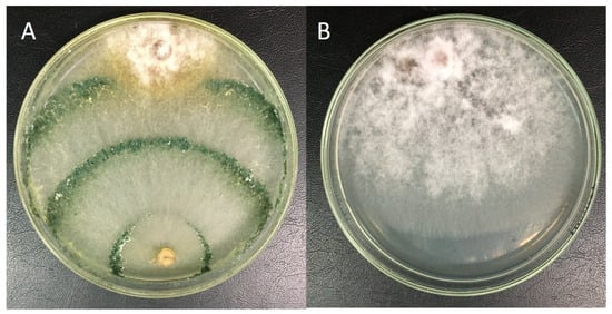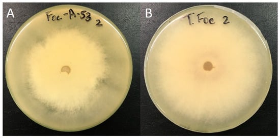 The evaluation of volatile metabolites was carried out according to the methodology described by Dennis and Webster [31]. Culture disks of both fungi (5 mm) were inoculated in the center of Petri dishes with PDA (90 mm), and the lids were removed. The bottoms containing an antagonist and a pathogen were placed together and sealed using Parafilm® M (Darmstadt, Germany)and incubated at 30 ± 1 °C under dark conditions. The pathogen was in the upper plate in order to avoid any interference by antagonistic spores in the plate inoculated with Foc. As control, a bottom containing the pathogen was used, overlapping with another containing only PDA medium (Section S1).