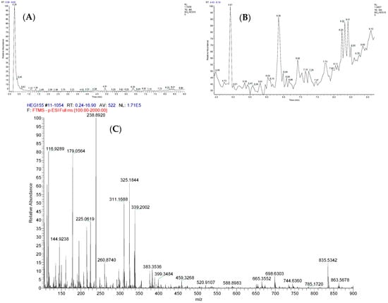 (A) Total ion chromatogram (TIC) obtained for ethyl acetate from T. harzianum LBAT-53 by reversed-phase UHPLC-ESI-MS/MS, (B) expanded ion chromatogram of metabolites with a Rt = 4–9.5 min, and (C) total ion spectrum of the ethyl acetate extract obtained from the culture broth of the strain LBAT-53 in negative ionization mode.