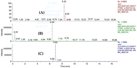 Extracted ion chromatograms (A–C) obtained from the ethyl acetate crude extract of T. harzianum (LBAT-53) based on the theoretical masses of anthraquinones studied by Laub et al. [34].