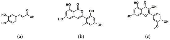 Caffeic acid (a), trichophenol A, (b) and isorhamnetin (c) detected in the crude extract of ethyl acetate from T. harzianum (LBAT-53).