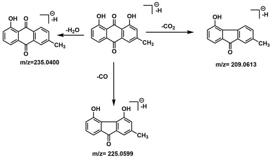 As an example, the fragmentation patterns of chrysophanol and endocrocin were examined by Ms2 analysis (Figure 8 and Figure 9). Characteristic product ions of chrysophanol corresponded to loss of a neutral molecular fragment, such as CO2 resulting in a product ion at m/z = 209, H2O [M-H-18]− at m/z = 235, and CO resulting in the base peak at m/z = 225 was detected. In Figure 8 is shown the fragmentation pathway proposed for this molecule.