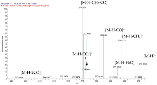Two additional anthraquinones—1,8-dihydroxy-3-(hydroxymethyl)anthracene-9,10-dione (m/z = 269.0457 with Rt = 6.49 min and endocrocin (m/z = 313.0353 with Rt = 6.95 min)—were identified (Figure 6) based on combined data available on the mass spectra with molecular weight and characteristic fragment ions that were previously identified by Laub et al., 2020 [34].