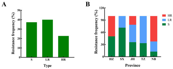 Resistance frequency of Fusarium fujikuroi to prochloraz in Zhejiang province (A) and major regions (B) of Zhejiang province in 2022. HZ: Hangzhou, SX: Shaoxing, JH: Jinhua, TZ: Taizhou, NB: Ningbo. R: prochloraz resistance, S: prochloraz sensitive, HR: high-level resistance, LR: low-level resistance.