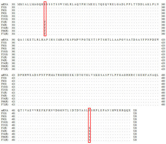 The Ffcyp51b gene of prochloraz-resistant and -sensitive F. fujikuroi isolates was amplified and sequenced (Figure 2). The 511th amino acid F (TTC) was replaced by S (TCC) between Pro-S and Pro-R. In addition to F511S, a previously reported S (TCT) to T (ACT) mutation at amino acid 312 in the prochloraz-resistant isolate was detected at FfCYP51B in Pro-R.