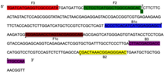 The cyp51b (GenBank accession: CP023101.1) containing point mutation sequence of prochloraz wild mutant JH1 was used as a template. Using the online software Primer Explore V5 (https://primerexplorer.jp/e/v5_manual/, accessed on 15 December 2019), a set of specific amplification detection primers (Table 5 and Figure 3), including the outer primer F3/B3 and the inner primer FIP/BIP, were screened according to the LAMP primer design principle. The primers were synthesized by GenScript Corporation, centrifuged at 8000 rpm for 15 s, dissolved in sterile water, and stored at 4 °C.