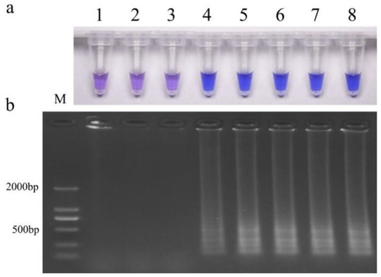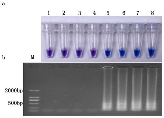 Results of LAMP detection under different DNA template concentrations. (a) HNB color change; (b) gel electrophoresis. M, DNA marker; 1, ddH2O; 2, 0.0001 ng/μL; 3, 0.001 ng/μL; 4, 0.01 ng/μL; 5, 0.1 ng/μL; 6, 1 ng/μL; 7, 10 ng/μL; 8, 100 ng/μL.