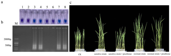 Rice seedlings inoculated with both sensitive and resistant isolates showed spindling. There was no significant difference in pathogenicity between the sensitive and resistant isolates. Rice seedlings treated with prochloraz after inoculation with sensitive isolates were consistent with the control, while rice seedlings inoculated with resistant isolates still showed spindling. Prochloraz had a good control effect on malignant seedling disease in rice, but the resistance isolate had no obvious effect. The LAMP test showed positive results for seedlings inoculated with resistant isolates. Therefore, this LAMP system can detect resistant isolates in rice seeds and seedlings.