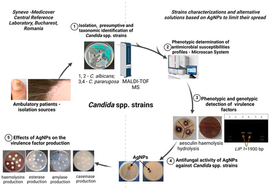 A total of 62 Candida spp. strains were provided by the Central Reference Synevo-Medicover (Bucharest, Romania) and previously isolated from cutaneous infections represented by nail fragments, interdigital scales, and scales from ambulatory patients during 2021 (Supplementary Table S1) The isolates’ identification was performed based on presumptive characteristics on chromogenic culture media using CHROMagarTM Candida (CHROMagar, Paris, France), and taxonomic identification was carried out using MALDI-TOF MS MBT Smart, with MSP 96 target polished steel BC (Bruker system, Berlin, Germany) (see Figure 1).