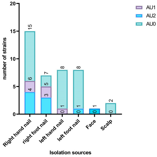 The qualitative analysis of AgNPs showed that most of the Candida spp. strains analyzed in this study were identified as having arbitrary unit values of 0 (AU0; 66.12%), 1 (AU1; 19.35%), and 2 (AU2; 14.51%). In correlation with the isolation sources, it was observed that most strains of Candida spp. that presented arbitrary units (AU) = 2 and AU = 1 originated from the right hand nail (four and six strains, respectively), followed by the right foot nail (three and five strains, respectively). However, AU = 0 was the predominant identified value for the qualitative screening of AgNPs (see Figure 2).