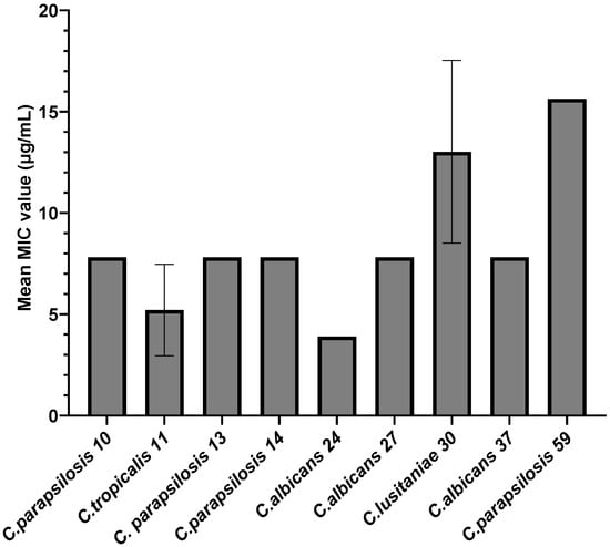In the case of the strains for which, following the qualitative testing, an inhibition zone equivalent to 2 arbitrary units was obtained (n = 9), the minimum inhibitory concentration values were also determined. According to Figure 3, the inhibitory effect of AgNPs depends on the species to which the tested strain belongs. Thus, the average MIC values obtained ranged from 3.90 µg/mL to 15.62 µg/mL, with the most sensitive strain being C. albicans 24 (MIC = 3.90 µg/mL), followed by C. tropicalis 11 (MIC = 5.20 µg/mL), while the most resistant strains were C. parapsilosis 59 (MIC = 15.62 µg/mL) and C. lusitaniae 30 (MIC = 13.02 µg/mL). For subsequent tests, MIC/2 and MIC/4 were considered, with fractions of the MIC value being determined for each strain.