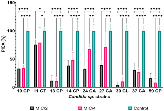 Adherence inhibition percentage (PICA%) values for AgNPs compared to the Candida spp. strains (* p < 0.05, ** p < 0.001, **** p < 0.0001) (Dunnett’s multiple comparisons test).
