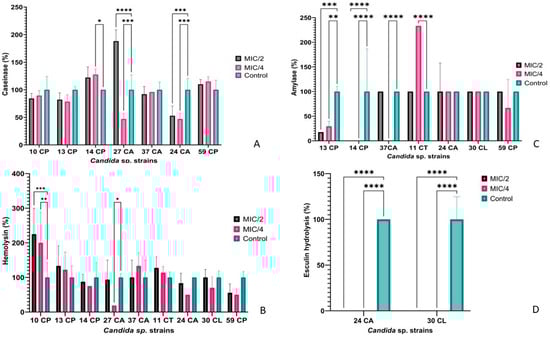Of the tested Candida strains, 79.03% were able to hydrolyze casein, and 93.55% hydrolyzed aesculin. Smaller percentages of strains were able to secrete amylase (35.48%), hemolysins (30.65%), and lipases (20.97%). No Candida strain was able to produce gelatinases, DNase, or lecithinase. Under these conditions, the strains that presented the capacity to secrete the most varied spectrum of soluble virulence factors and the greatest sensitivity to the antimicrobial action of AgNPs were tested in order to establish the effects of AgNPs on the release of hydrolytic enzymes linked to virulence and pathogenicity. For caseinase production, the best results were obtained in the C. albicans 24 strain, for which the secretion capacity was reduced by up to 50% compared to the untreated strain. A similar result was obtained for the C. albicans 27 strain treated with MIC/4 AgNPs (47.05%), but when the concentration of AgNPs was increased the effect was the opposite, stimulating the secretion of caseinase in the culture medium (Figure 5A).