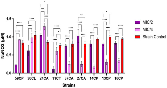 Exogenous NO at sublethal doses may induce microorganisms within biofilms to switch from sessile behavior to free-swimming planktonic behavior. NO, at non-lethal levels, has also been shown to increase the susceptibility of various biofilms to antimicrobial treatments [61]. From Figure 6, it can be observed that the concentration of extracellular NO increased with the increase in the AgNPs’ concentration in most C. parapsilosis strains, except for 59 CP, which exhibited a higher MIC value compared to other strains. In the case of C. albicans strains, it was highlighted that lower sample concentrations generated higher extracellular NO. Among the strains tested at MIC/2, it can be seen that only strains 27CA (p < 0.01) and 24CA (p < 0.05) showed a significantly higher extracellular NO concentration than the strain control (Figure 7). A significant decrease in extracellular NO concentration was observed compared to the strain control at MIC/4 values for variants 37CA, 27CP, 14CP, 13CP, and 10CP (p < 0.0001), which may indicate that the microorganisms used a variety of enzymes and complex processes to recognize, collect, and convert NO into less reactive molecules. Due to its high reactivity, NO can be at inappropriate concentrations and is thus rapidly transformed by microorganisms through the process of aerobic denitrification and oxidation [62].