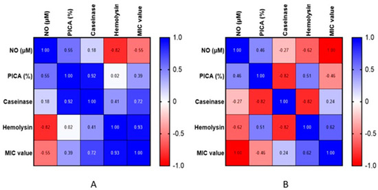 Pearson correlation among extracellular NO content, adhesion inhibition percentage (PICA%), caseinase activity (%), amylase activity (%), and hemolysin (%) for C. albicans (A) and C. parapsilosis (B).